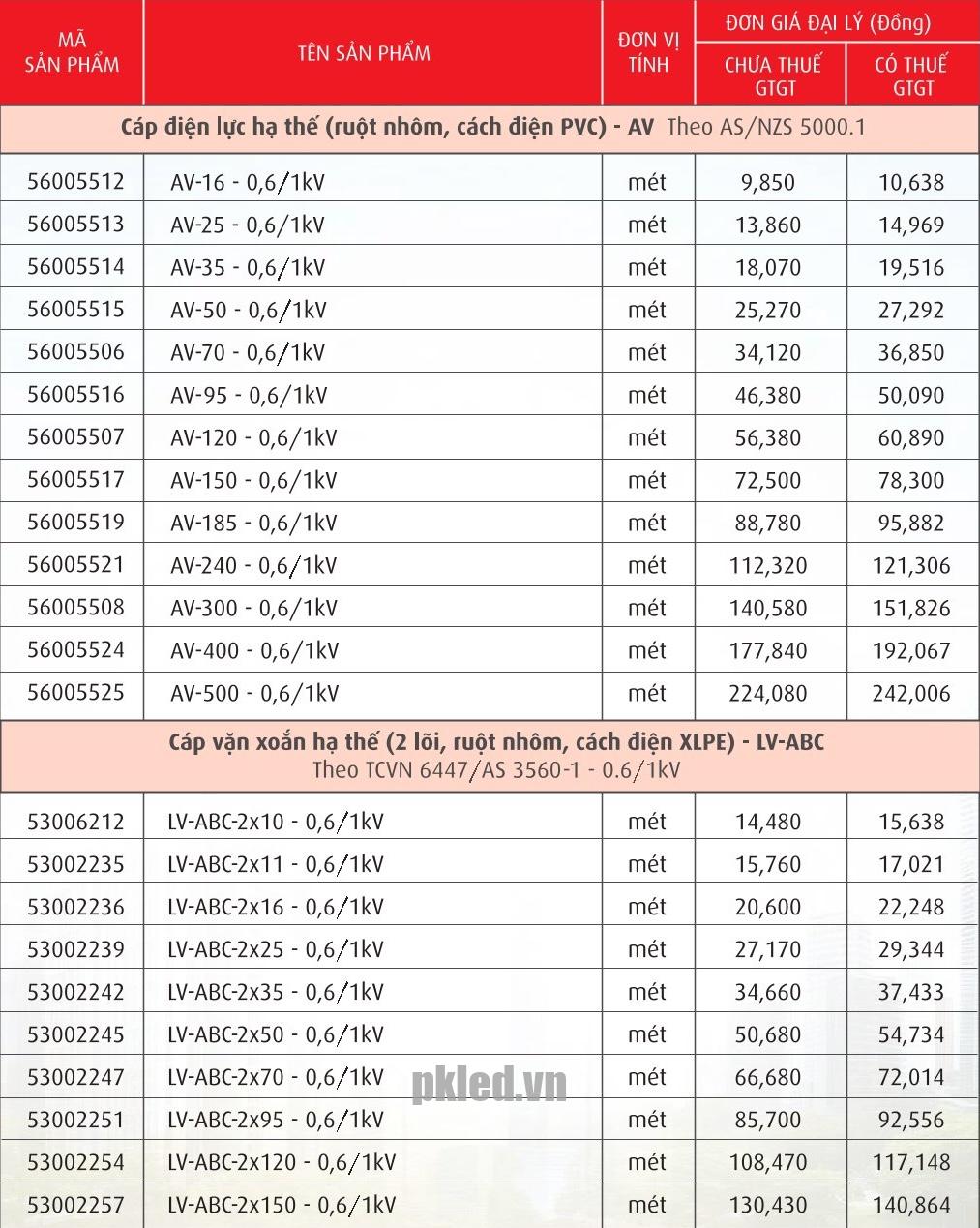 Cáp điện lực hạ thế (ruột nhôm, cách điện PVC) – AV – Theo AS/NZS 5000.1