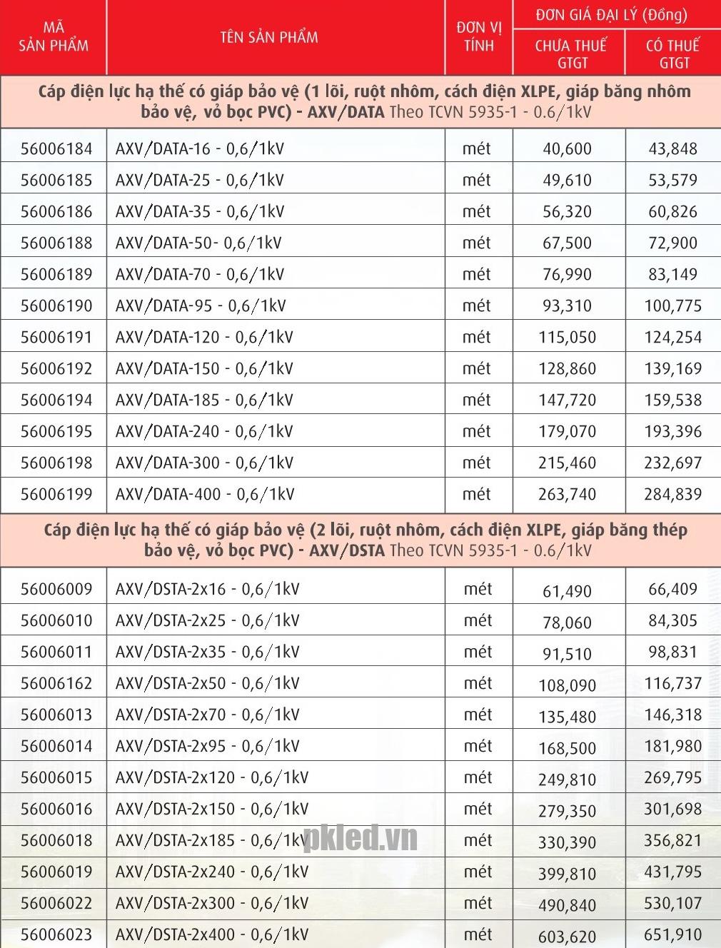 – Cáp AXV/DATA, AXV/DSTA dùng cho hệ thống truyền tải và phân phối điện ngầm, cấp điện áp 0,6/1 kV, lắp đặt cố định.