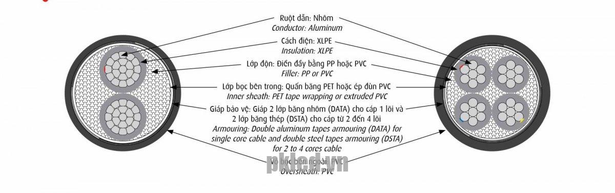 Cáp điện lực hạ thế có giáp bảo vệ (3 lõi, ruột nhôm, cách điện XLPE, giáp bằng thép bảo vệ, vỏ bọc PVC) – AXV/DSTA. Theo TCVN 5935-1 – 0.6/1kV