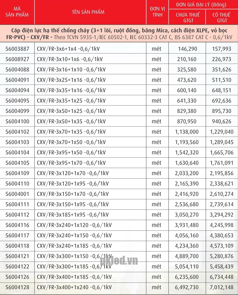 | Tiêu chuẩn | - TCVN 5935-1 / IEC 60502-1. - TCVN 6612 / IEC 60228. - IEC 60331-21; IEC 60332-1,3. - BS 6387; BS 4066-1,3. - AS/NZS 3013 |