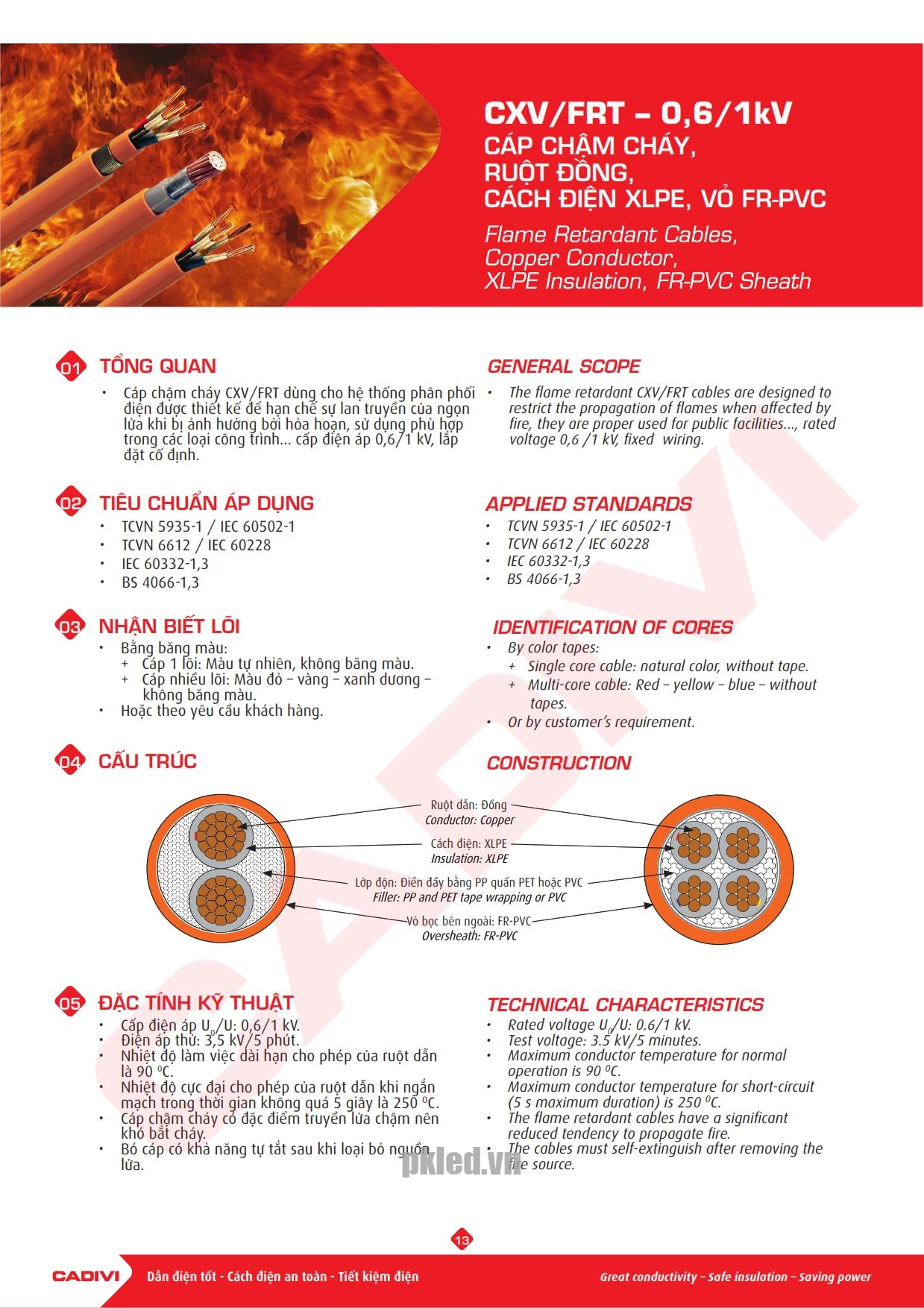 – Cáp chậm cháy CXV/FRT dùng cho hệ thống phân phối điện được thiết kế để hạn chế sự lan truyền của ngọn lửa khi bị ảnh hưởng bởi hỏa hoạn, sử dụng phù hợp trong các loại công trình… cấp điện áp 0,6/1 kV, lắp đặt cố định.