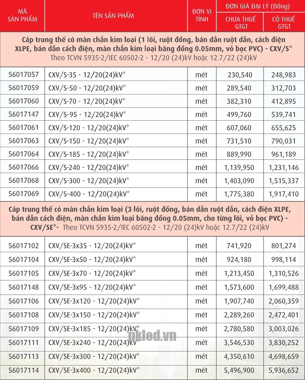 Cáp trung thế có màn chắn kim loại (1 lõi, ruột đồng, bán dẫn ruột dẫn, cách điện XLPE, bán dẫn cách điện, màn chắn kim loại bằng đồng 0.05mm, vỏ bọc PVC) – CXV/S. Theo TCVN 5935-2 / IEC 60502-2 – 12/20 (24)kV hoặc 12.7/22 (24)kV