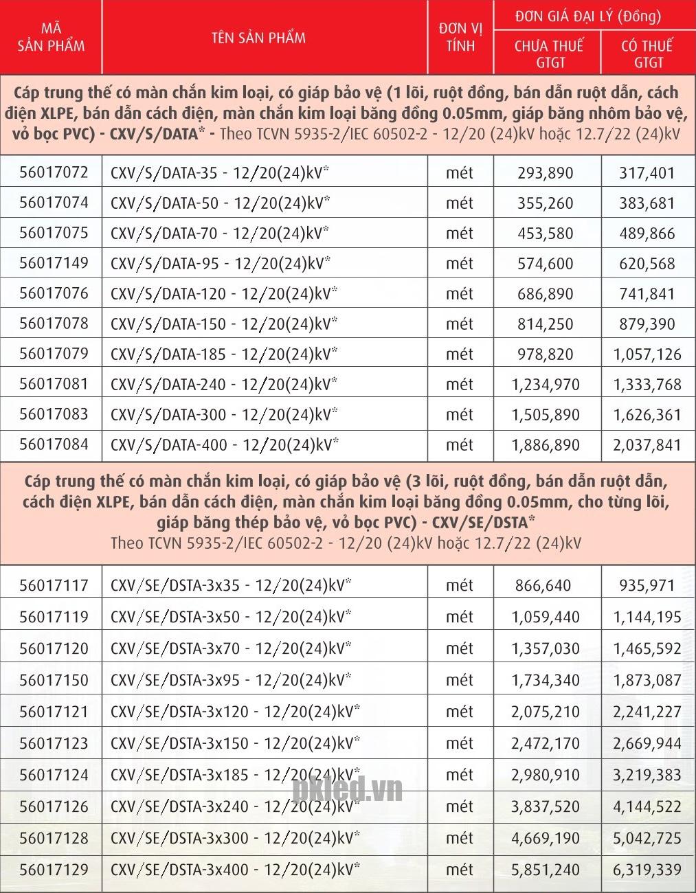 Cáp trung thế có màn chắn kim loại, có giáp bảo vệ (1 lõi, ruột đồng, bán dẫn ruột dẫn, cách điện XLPE, bán dẫn cách điện, màn chắn kim loại bằng đồng 0.05mm, giáp bằng nhôm bảo vệ, vỏ bọc PVC) – CXV/S/DATA. Theo TCVN 5935-2 / IEC 60502-2 – 12/20 (24)kV hoặc 12.7/22 (24)kV