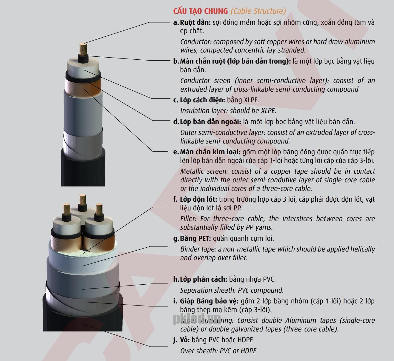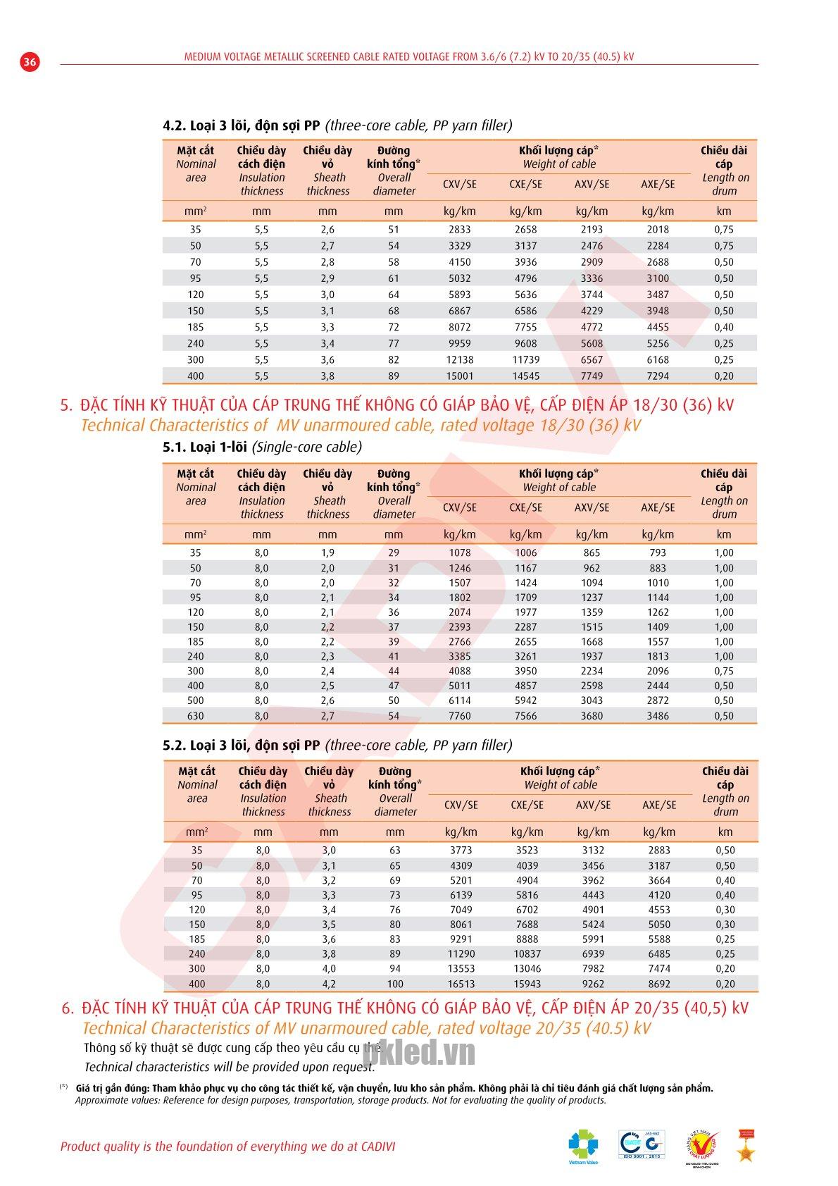 – 18/30 (36) – 20/35 (40,5) kV: theo tiêu chuẩn TCVN 5935-1995/ IEC502