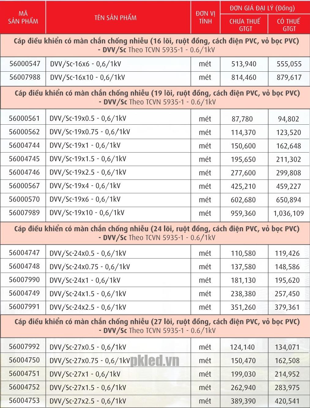 – Cáp điều khiển có màn chắn chống nhiễu DVV/Sc sử dụng cho mạch điều khiển, cấp điện áp 0,6/1 kV, tần số 50Hz, lắp đặt cố định.