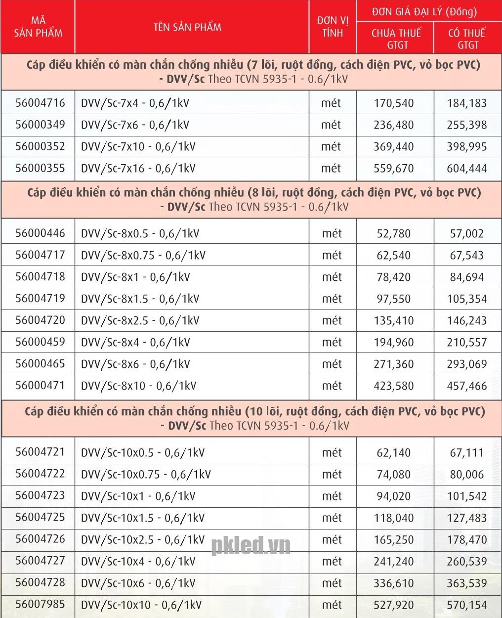 – Cáp điều khiển có màn chắn chống nhiễu DVV/Sc sử dụng cho mạch điều khiển, cấp điện áp 0,6/1 kV, tần số 50Hz, lắp đặt cố định.