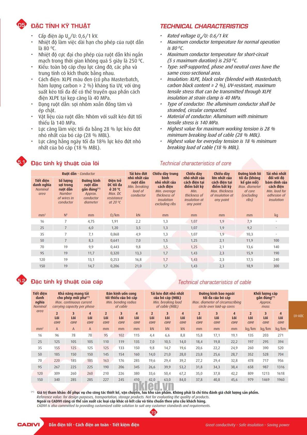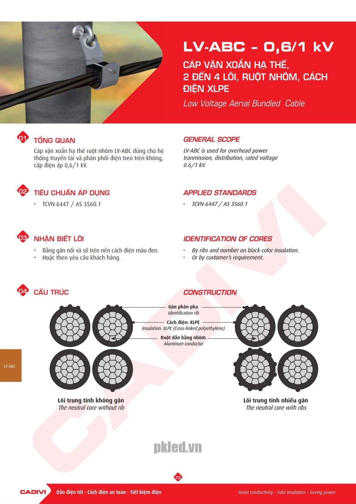 – Cáp vặn xoắn hạ thế ruột nhôm LV-ABC dùng cho hệ thống truyền tải và phân phối điện treo trên không, cấp điện áp 0,6/1 kV.