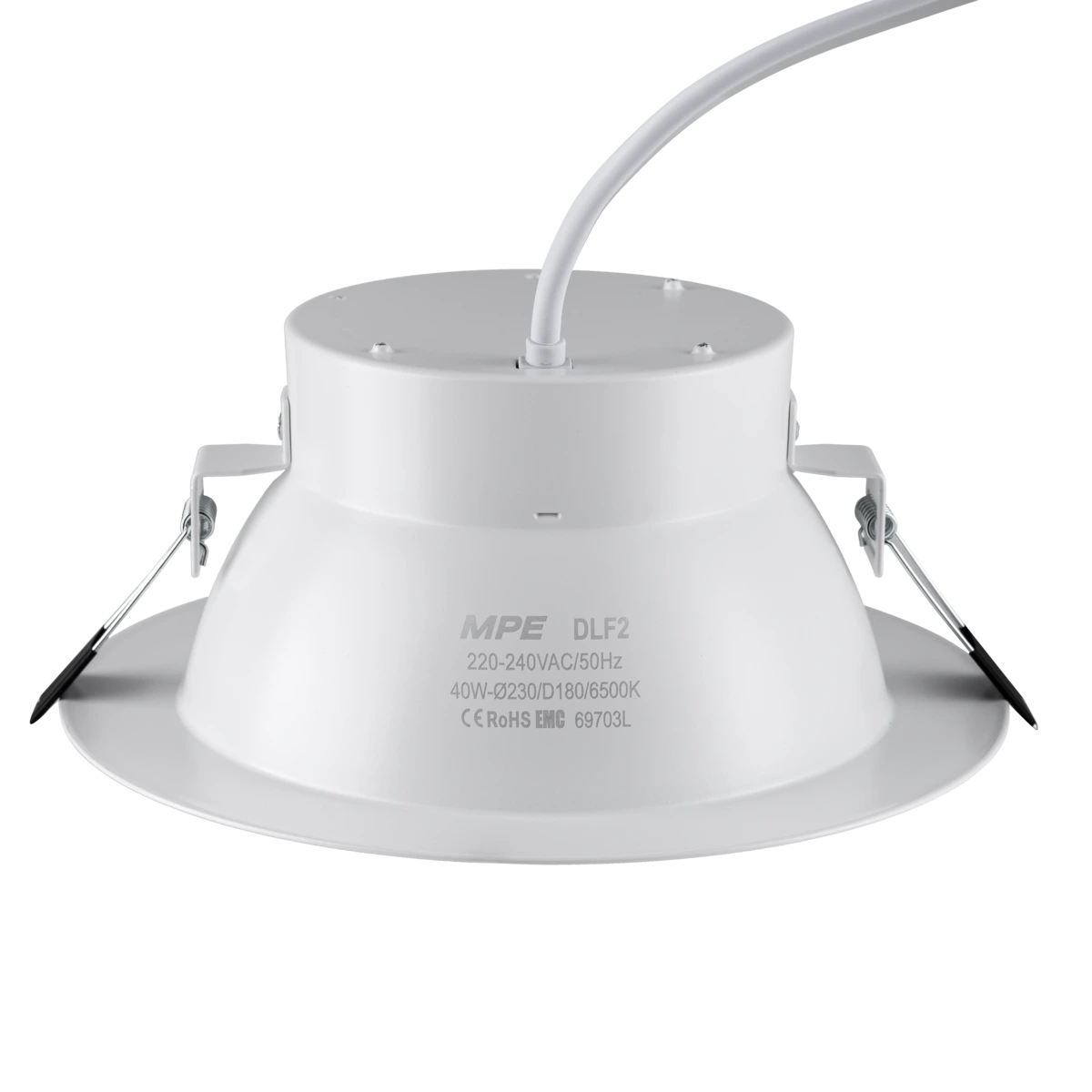 Đèn downlight âm trần nhôm MPE DLF2-40T 40W ánh sáng trắng mạnh mẽ, chiếu sáng rộng & tiết kiệm điện cho không gian lớn như showroom, sảnh.