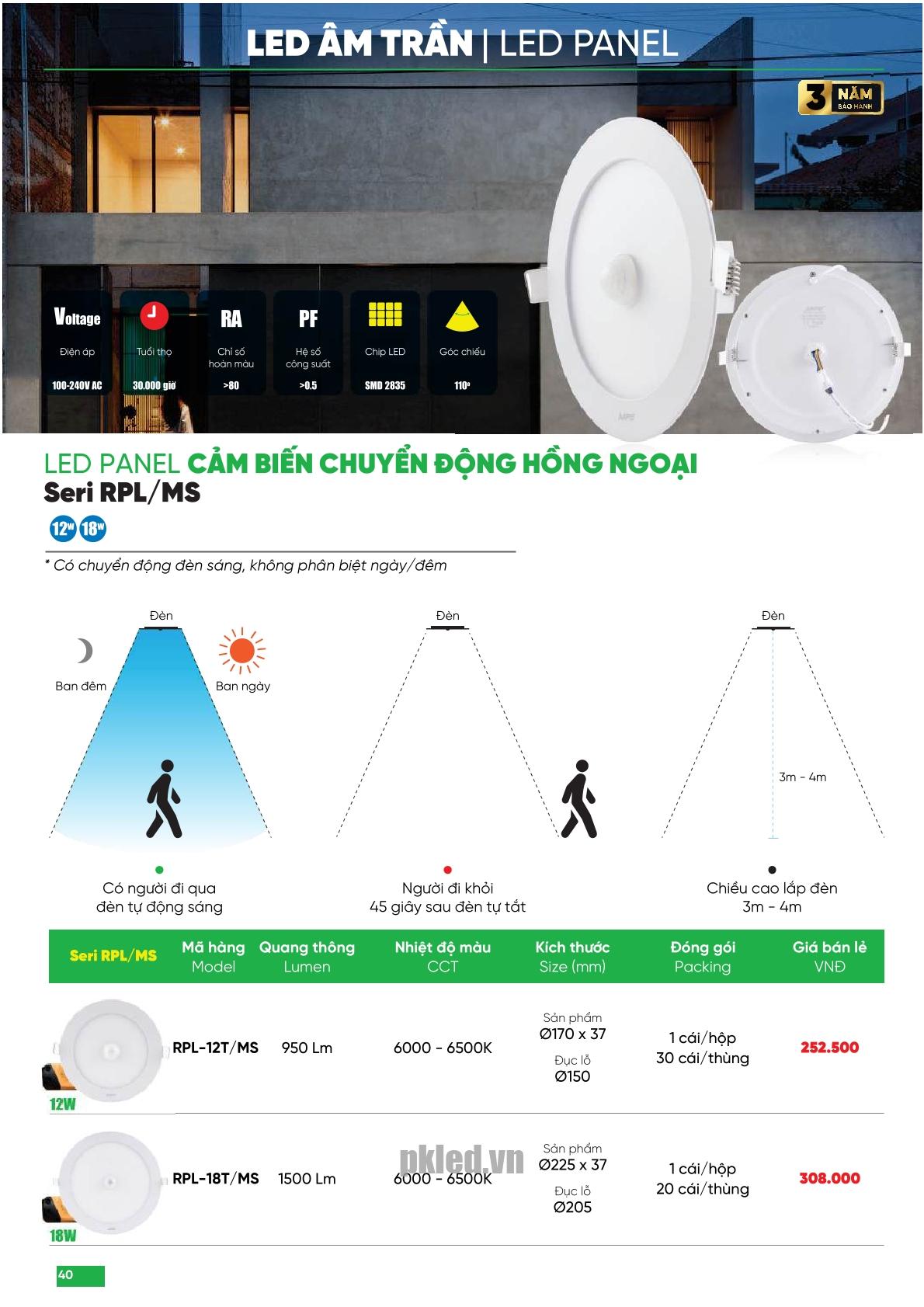 Đèn Led âm trần RPL-18T/MS với cảm biến vi sóng, bật sáng khi có người di chuyển, lý tưởng cho hành lang, cầu thang và khu vực công cộng.