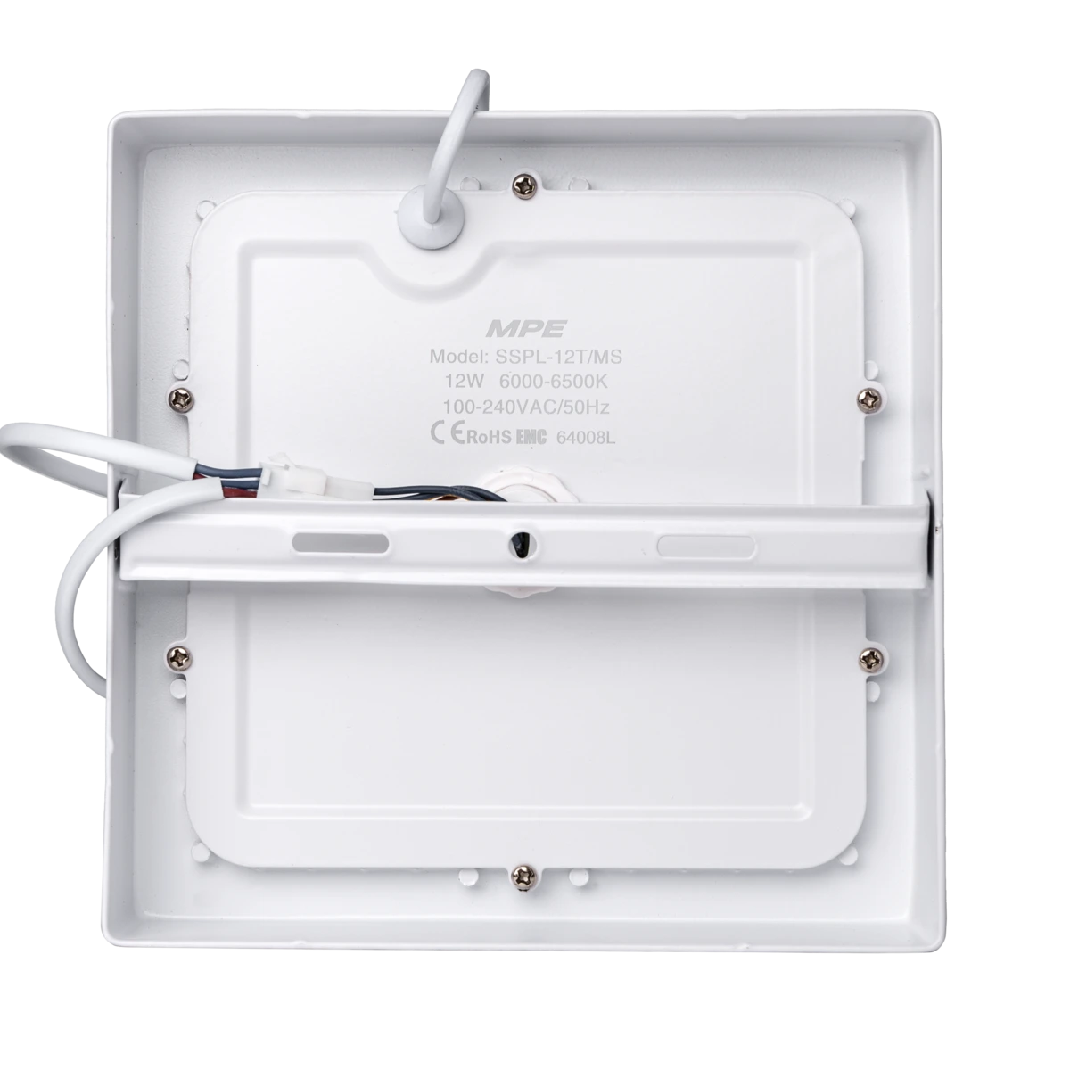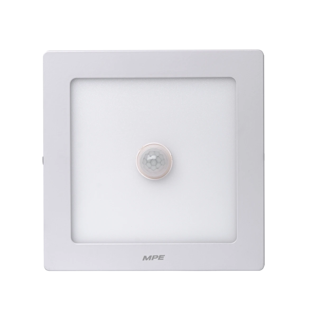Đèn LED panel ốp nổi vuông MPE SSPL-12T/MS 12W ánh sáng trắng, tích hợp cảm biến chuyển động, tiện lợi và tiết kiệm điện.