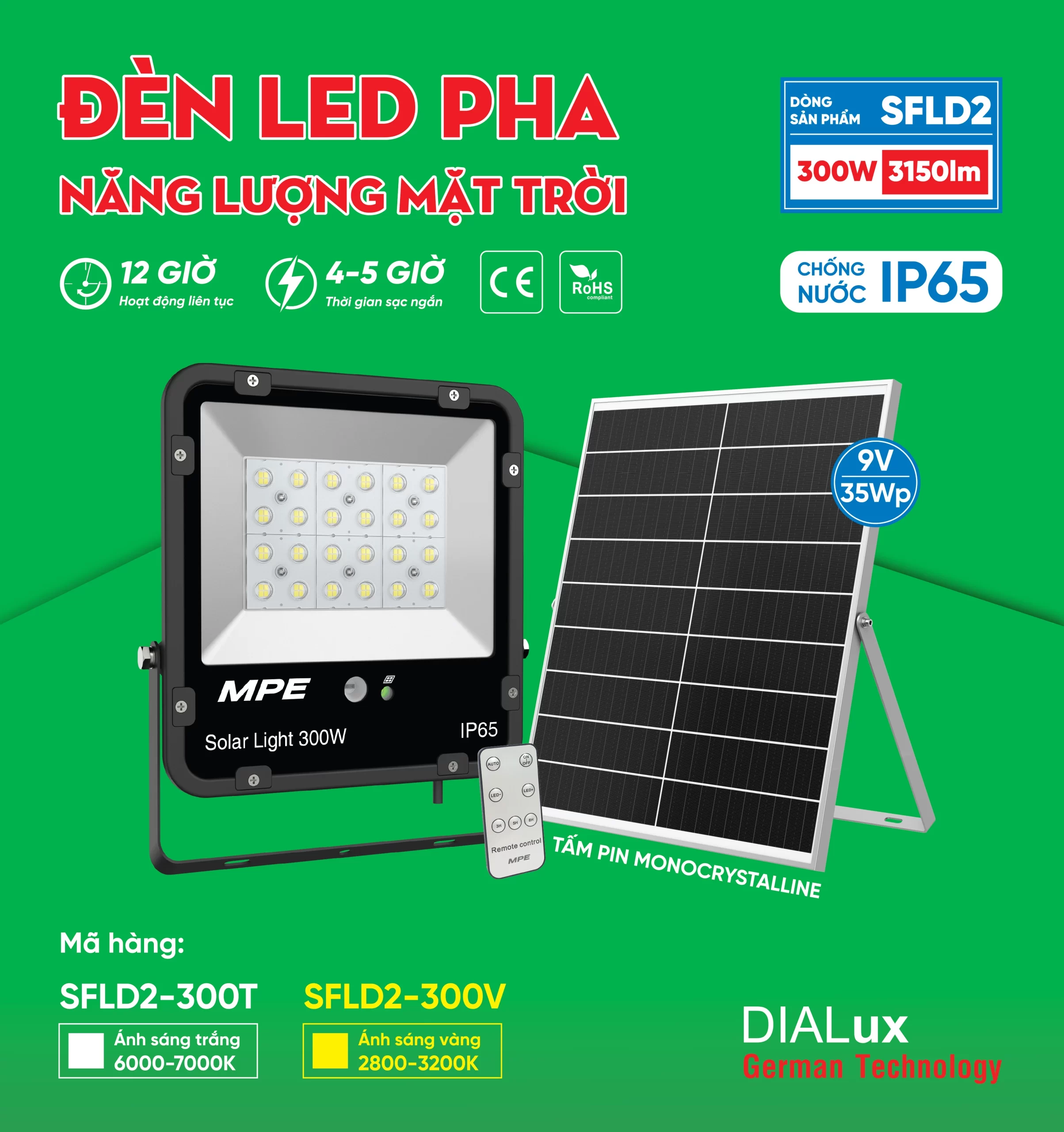 LED pha năng lượng mặt trời MPE SFLD2-300V 300W ánh sáng vàng ấm, pin tích hợp, chiếu sáng mềm & rộng cho sân vườn & công trình.