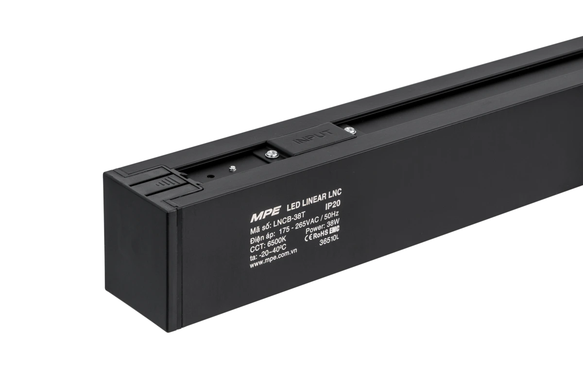 Đèn LED thanh điểm nổi MPE LNCB-38T là spotlight thanh nổi công suất 38W ánh sáng trắng 6000K cùng thân đen, kết hợp ánh sáng mạnh mẽ và kiểu dáng hiện đại. Ánh sáng trắng giúp làm nổi bật chi tiết vật thể và đường nét kiến trúc trong không gian rộng như showroom, cửa hàng hoặc khu thương mại. Chip LED chất lượng cao với chỉ số hoàn màu CRI >80 đảm bảo ánh sáng trung thực, rõ nét và bảo vệ mắt khi sử dụng lâu. Thiết kế thanh nổi giúp thi công nhanh – gọn; driver tích hợp và tuổi thọ ~30.000 giờ giúp sản phẩm hoạt động ổn định lâu dài. LNCB-38T là lựa chọn chiếu nhấn phong cách cho nội thất hiện đại và không gian thương mại.
