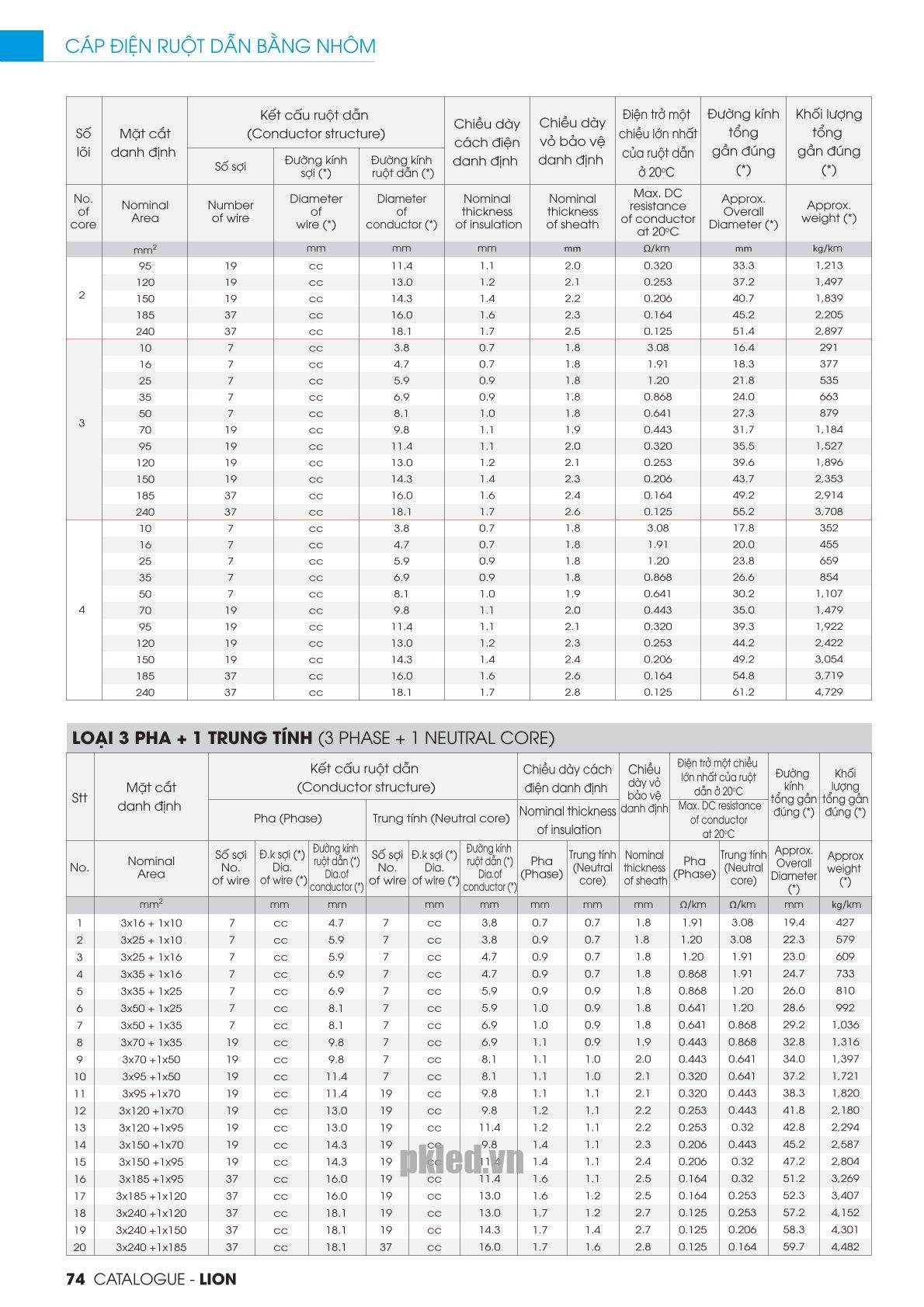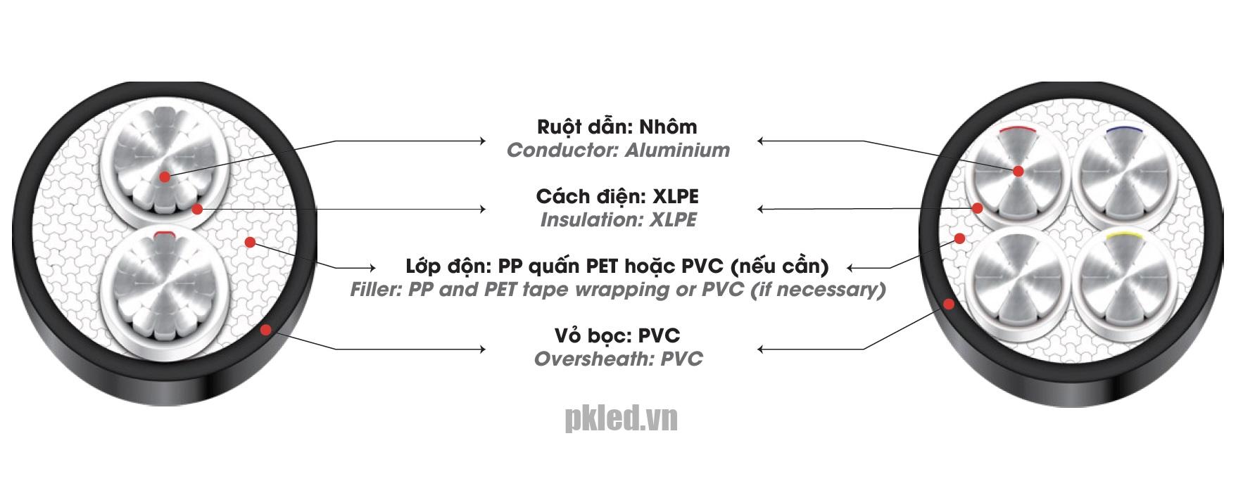 | Chất liệu | Cáp điện lực hạ thế, từ 1 đến 4 lõi, ruột nhôm, cách điện XLPE, vỏ PVC. |