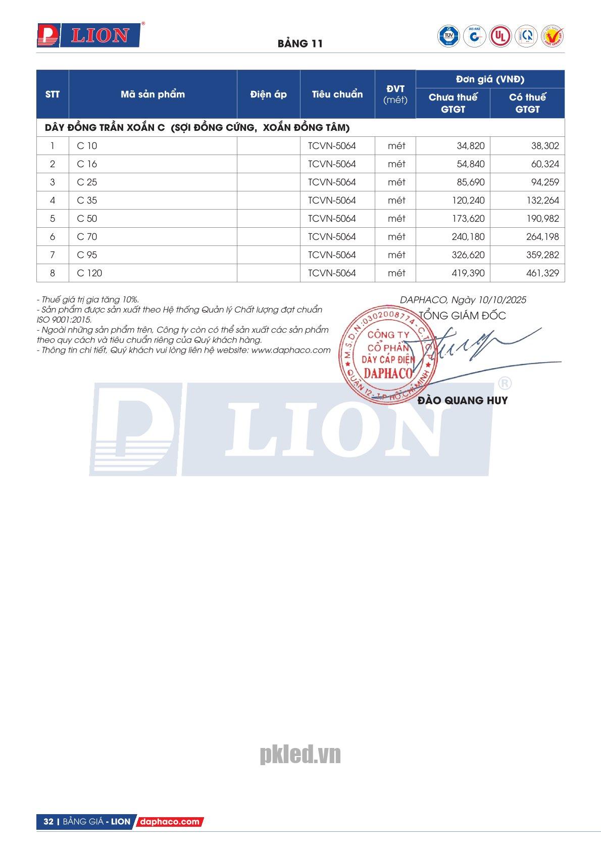Cáp điện C 120 thương hiệu Lion. Loại đây 120, có 1 lõi – ruột dẫn gồm 19 sợi – thuộc loại cáp đồng trần xoắn: