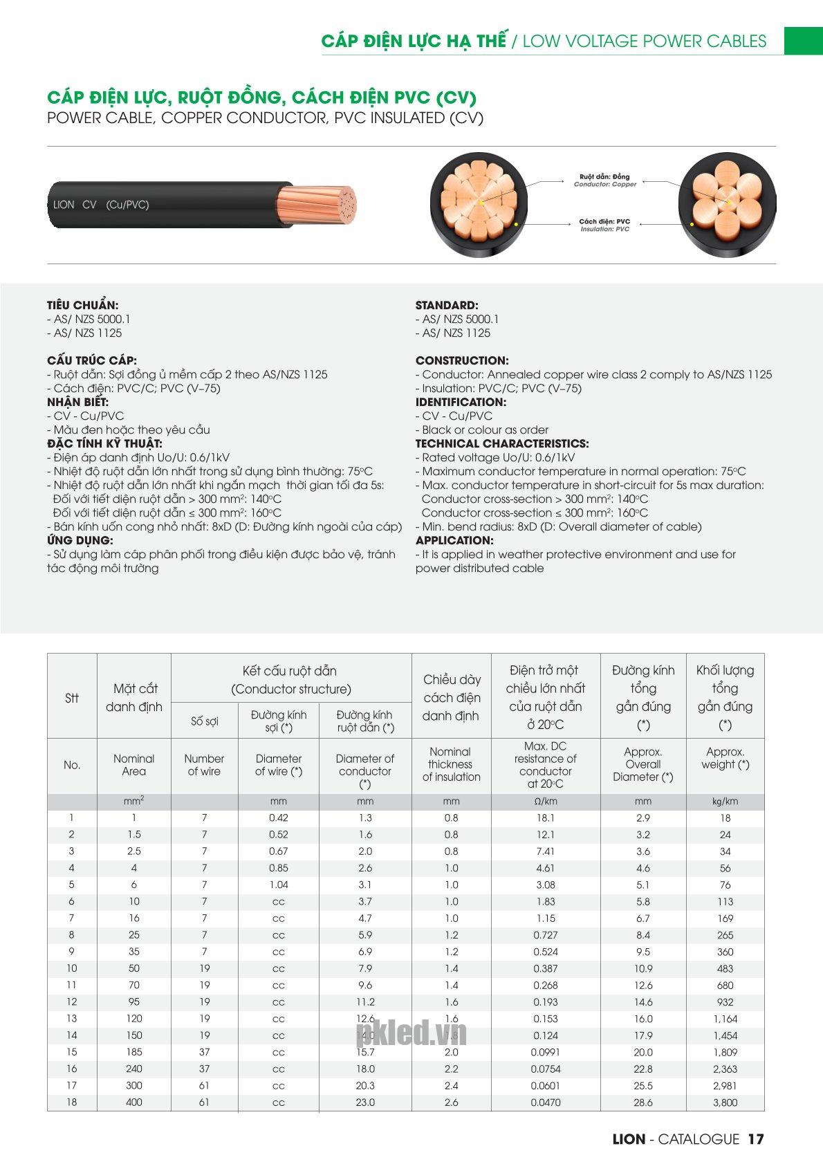 Dây điện CV 70 Lion, chịu điện áp 0.6/1kV. Tiết điện 70 có 1 lõi ruột đồng – cáp hạ thế ruột chứa 19 sợi dẫn mỗi lõi