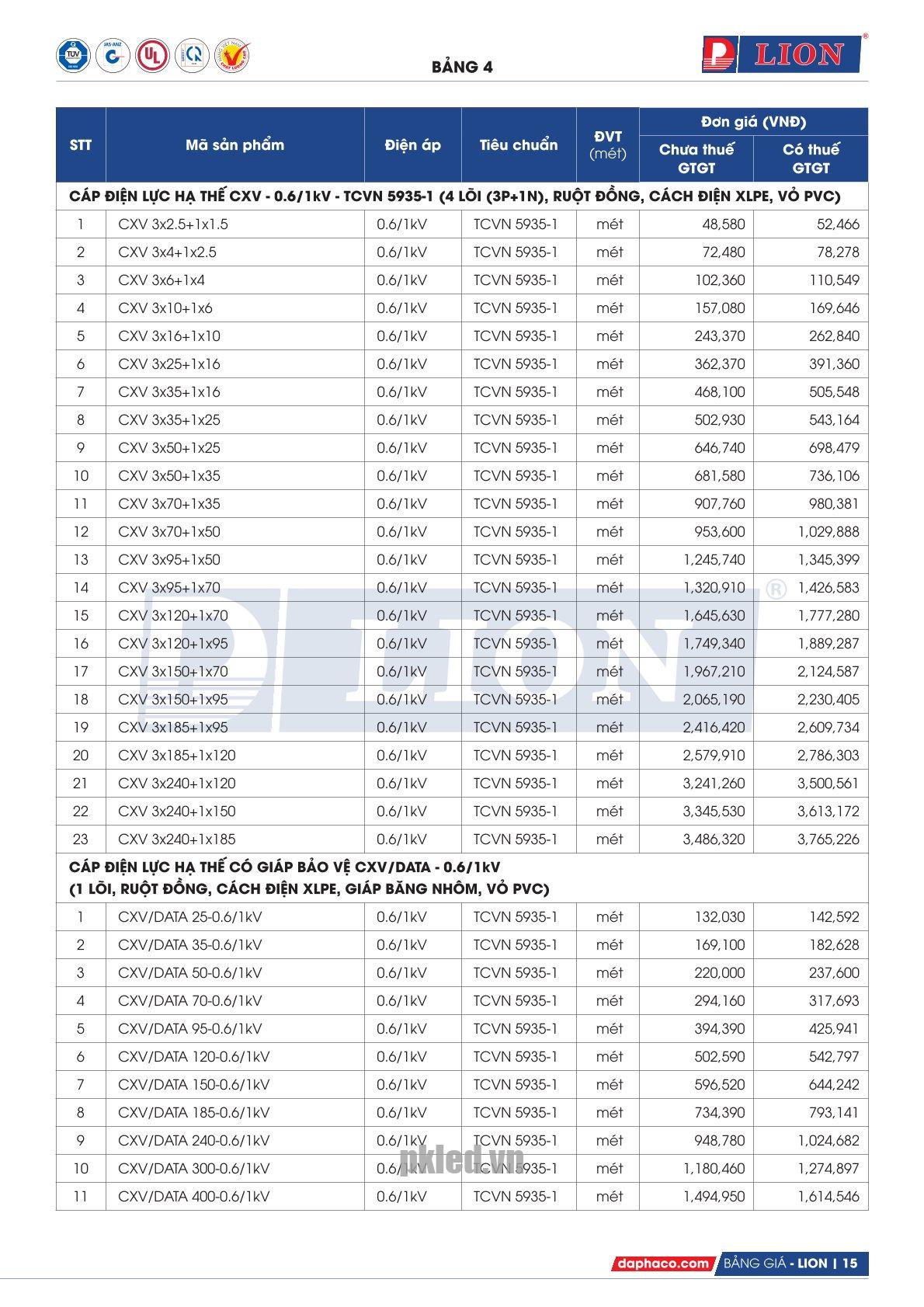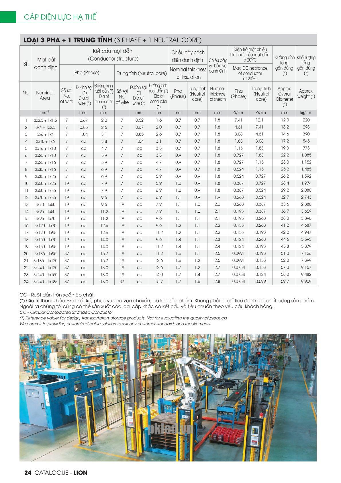 | Chất liệu | Cáp điện lực hạ thế, từ 1 đến 4 lõi, ruột đồng, cách điện XLPE, vỏ bảo vệ PVC. |