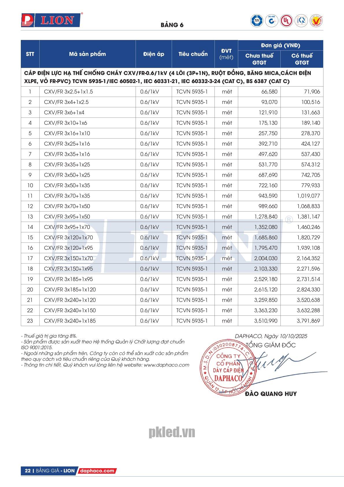 Dây điện CXV/FR 3×185+1×120 Lion, chịu điện áp 0.6/1kV. Tiết điện 3×185+1×120 có 4 lõi ruột đồng – cáp hạ thế chống cháy ruột chứa 37 sợi dẫn mỗi lõi