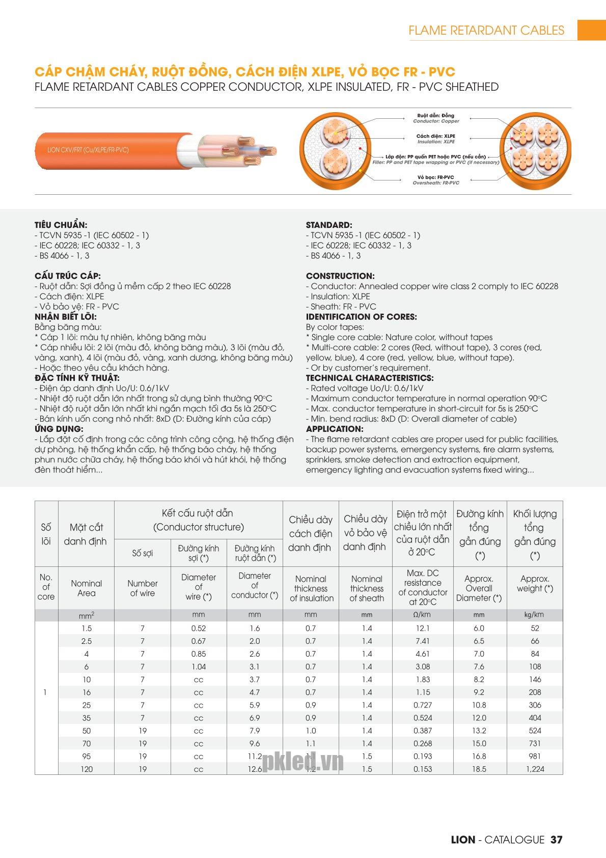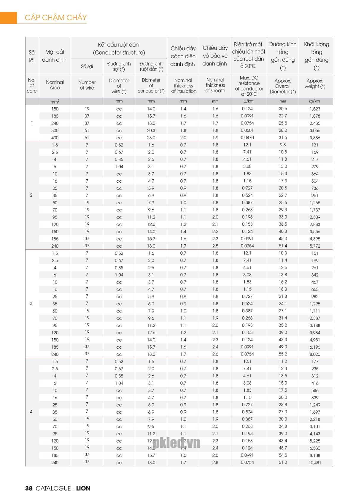 | Chất liệu | Cáp điện lực hạ thế chậm cháy, từ 1 đến 4 lõi, ruột đồng, cách điện XLPE, Vỏ FR-PVC. |