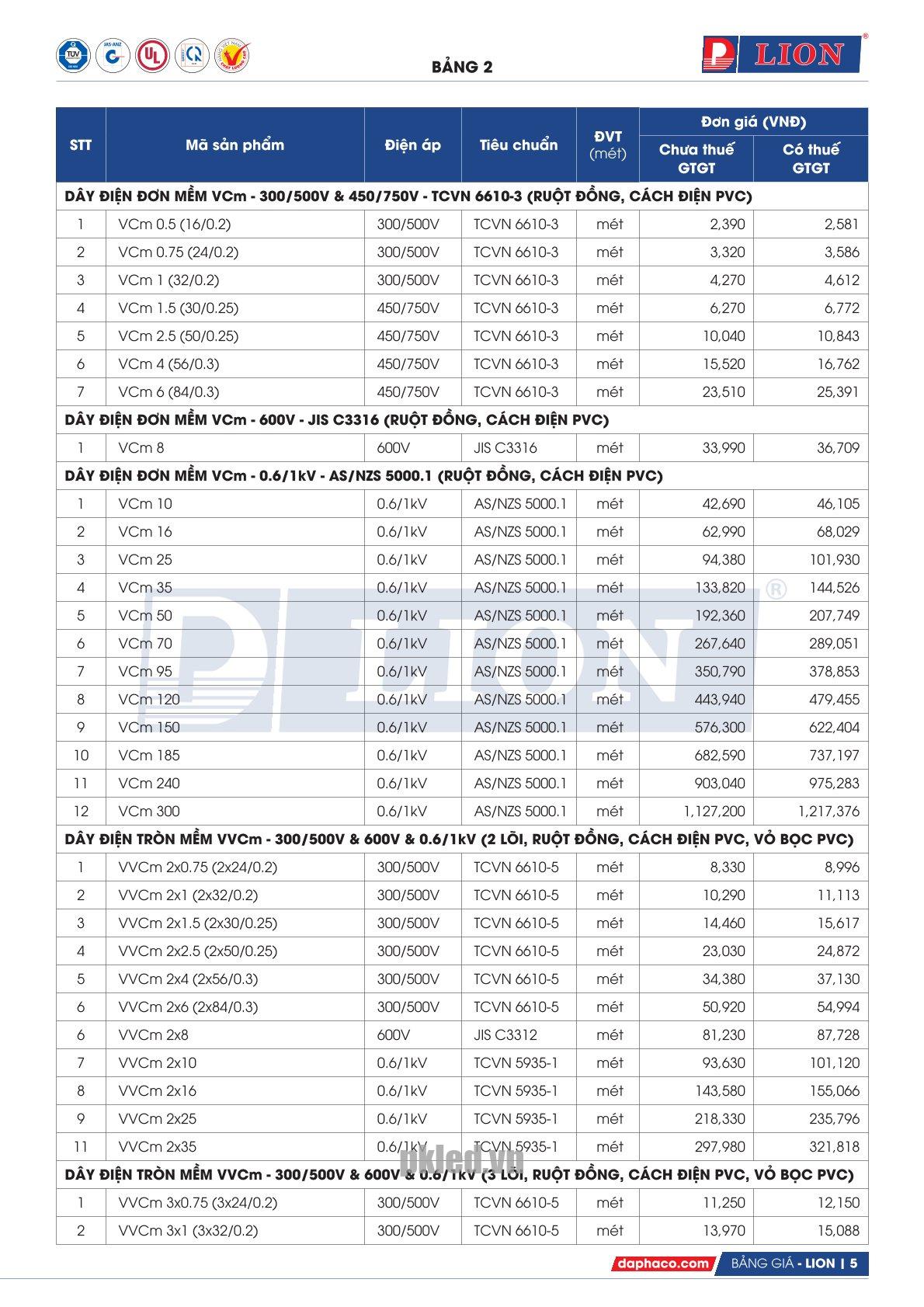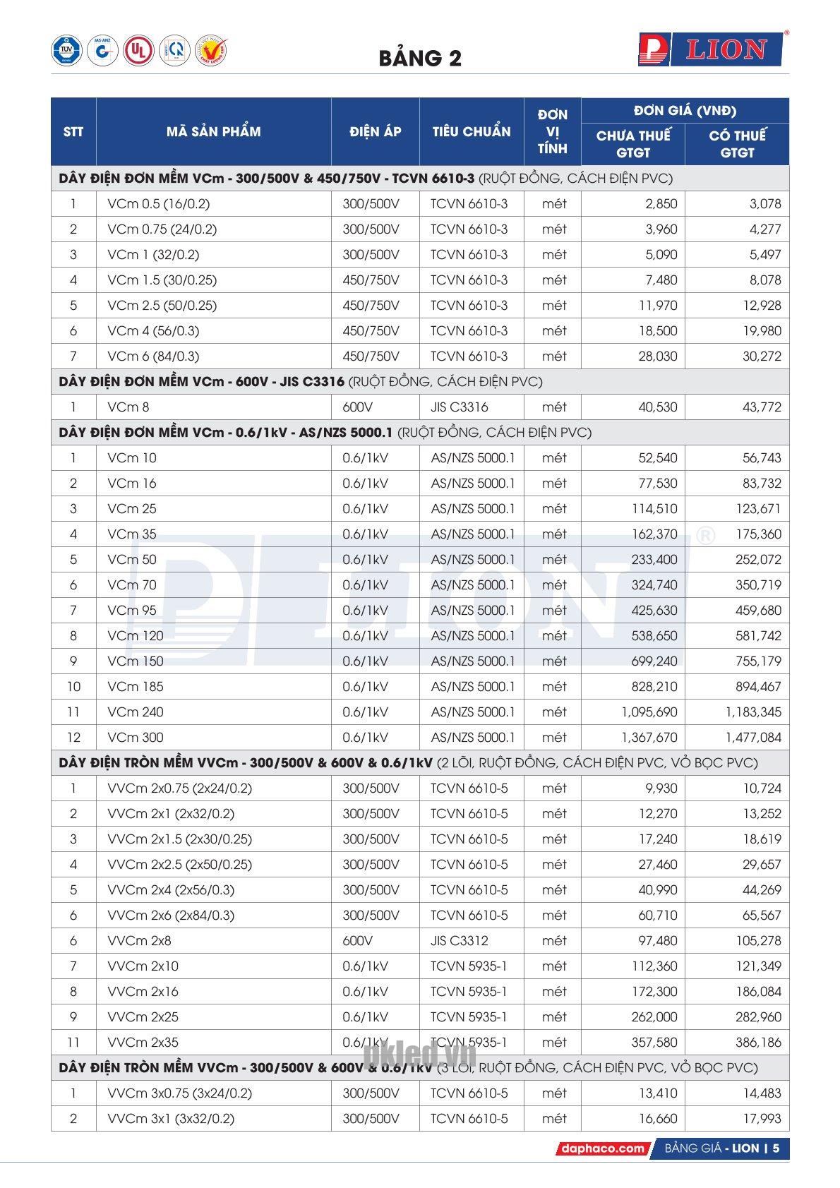| Chất liệu | Dây điện tròn mềm, từ 2 đến 4 lõi, ruột đồng, cách điện và vỏ bọc PVC. |